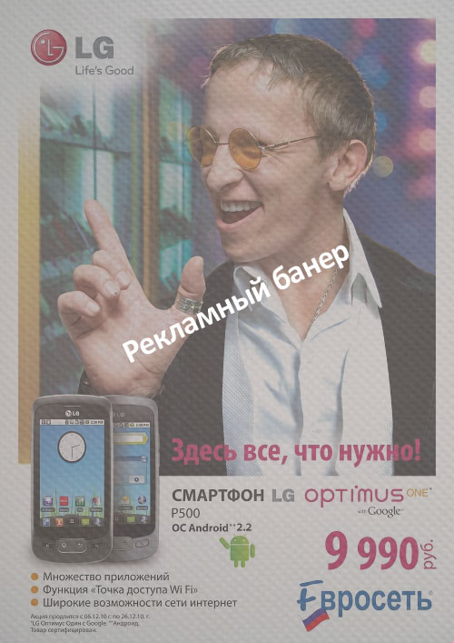 Можно расставить элементы рекламного банера в порядке очередности времени первой фиксации взгляда на этом элементе – в первую очередь взгляд привлекает лицо героя, затем рекламируемый телефон и так далее. В самую последнюю очередь респонденты обращают внимание на логотип производителя и читают описание товара.